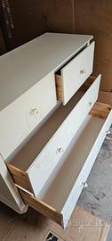 vendo a prezzo simbolico per trasferimento urgente cassettiera composta da due cassetti grandi e due piccoli in legno massello laccato bianco, pomoli in cristallo. Misure L 136cm, P 52cm, H 106 cm.