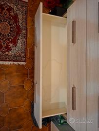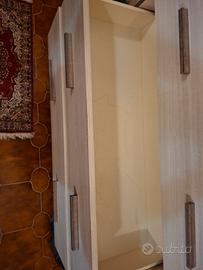 Questa cassettiera a tre cassetti è caratterizzata da una finitura chiara effetto legno con maniglie orizzontali scure, il mobile e stato usufruito infatti sono presenti delle macchie all'interno dei cassetti e la parte dietro del mobile e tutto funzionante ce solo la presenza di queste macchie. Il prezzo e trattabile.