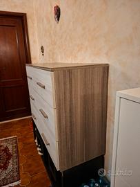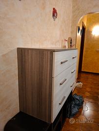 Questa cassettiera a tre cassetti presenta un design moderno con una struttura bicolore: una finitura chiara effetto legno e sui frontali e un piano superiore più scuro. larghezza 107 cm altezza 77 cm profondità 44 cm
