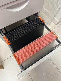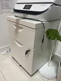 Cassettiera con schedario e chiave di sicurezza per tenere al sicuro i documenti. Provvista di ruote per poterla spostare con facilità.
