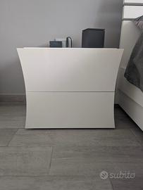 Cassettiera bianca lucida con 6 cassetti. Profondità 40cm, Altezza 82 cm, Larghezza 111cm. Set di 2 comodini bianchi lucidi. Profondità 40cm, Altezza 41,5cm, Larghezza 47,5cm.