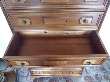Doppio pomello per ciascun cassetto in metallo lavorato con intarsi.