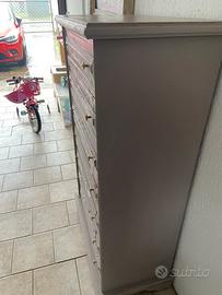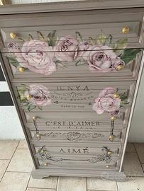 Cassettiera settimino in stole sgabby ronantici con fiori e scritte . Color tortora chiaro. Misure 77x37xH125