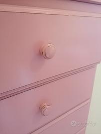 Vendo per inutilizzo bellissima cassettiera shabby chic in vero legno no truciolato, robusta e capiente, di colore rosa glicine. Le misure sono larghezza cm 58,profondità cm 45, altezza cm 120. Se si desidera il trasporto a domicilio, €20 di contributo.