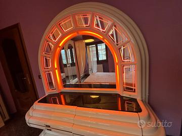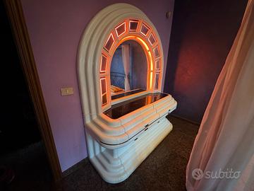 Cassettiera Space Age in legno laccato dotata di grande specchiera che si illumina. Stato di conservazione ottimo, articolo vintage di grande pregio prodotto tra gli anni 70-79.