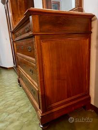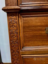 Vendo cassettiera, specchiera in noce con piano di marmo. Fabbricata artigianalmente e finemente intagliata, nella metà degli anni trenta nel centro italia. si compone di un cassetto superiore portagioie e di tre cassettoni inferiori,