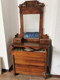 Cassettiera in legno antico con 4 cassetti e 3 chiavi + specchiera separata con due piccoli cassetti. Entrambi i pezzi sono in legno antico, periodo fine '800/inizi '900.