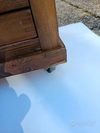 Cassettiera tipografica, presumibilmente anni 70, alta 1mt, larga 55 e profonda 60 cm. Sabbiata, antitarlo, mordenzata e finitura satinata, con 4 ruote piroettanti. Profondità cassetti 35mm. I primi 2 rivestiti con carta a gigli. Grazie.