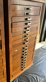 Vendo bella cassettiera in legno da tipografo autentica, con cassetti integri contenenti caratteri tipografici in metallo. Presenti segni del tempo che conferiscono al mobile un fascino autentico e lo rendono un caratteristico elemento d’arredo. ( indico in particolare i segni sul top del mobile come si vede in foto,)