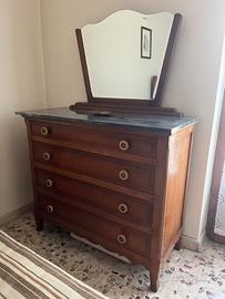 con Specchio e Piano in Marmo: Un elegante comò a quattro cassetti, ideale per riporre biancheria e oggetti personali. Il piano superiore è in marmo scuro, che aggiunge un tocco di raffinatezza e resistenza. Completa il mobile uno specchio a forma di ventaglio, che ne esalta la bellezza e la praticità. I cassetti sono dotati di maniglie dorate ornate.