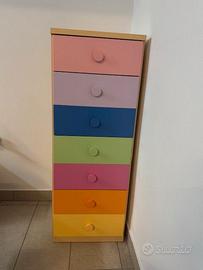 Cassettiera in legno, con 7 ampi cassetti colorati. Ideale per camerette per bambini.