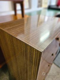Piccola cassettiera vintage anni 60 in formica a 5 cassettiera con piedini in ferro e ottone. Condizioni generali ottime. Misura: Larghezza cm 51 - Profondità cm 33 - Altezza cm 92