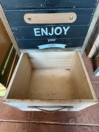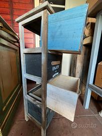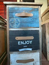 mobiletto in legno dallo stile vintage–industriale, composto da 4 cassetti tutti diversi tra loro per colore, grafica e finitura. Il design è caratterizzato da un effetto vissuto e shabby, con maniglie in stile cuoio e scritte decorative che richiamano un’estetica retrò.