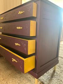 La finitura viola/vinaccia profonda, abbinata alle maniglie dorate, con gli interni dei cassetti che spiccano color senape …la rende un mobile raffinato e di grande impatto visivo, ideale per ambienti moderni, classici o di design.