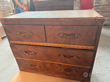 Vendo splendida cassettiera artigianale in stile valigia d’epoca, rivestita in pelle marrone con dettagli in ottone e finiture borchiate.