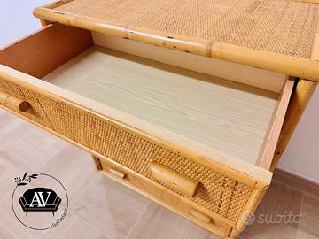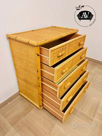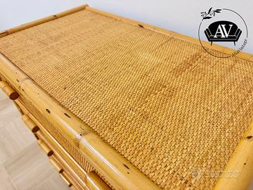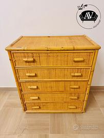 Cassettiera vintage anni ’70/’80 in bambù e rattan intrecciato.