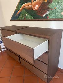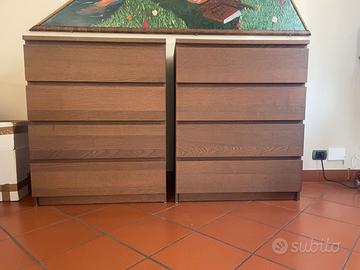 Vendo, causa trasloco: 2 cassettiere ikea modello Malm, color legno scuro, con 4 cassetti ciascuna. Misure per singola cassettiera: Altezza: 100 cm Larghezza: 80 cm Profondità: 48 cm con cassetto chiuso; 80,5 con cassetto aperto Misure interne al cassetto: 42,5 di larghezza; 72 cm profondità e 15,5 cm di altezza Buone condizioni (allego foto dettagli dei segni di usura piu evidenti)