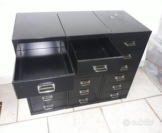 Come da foto 3 cassettiere per 18 cassetti totali e misure L85xP40xH67. Buone condizioni i cassetti ma esteriormente necessita di una mano di vernice. Disponibili in un magazzino fronte strada a Gorizia e facilmente trasportabili.