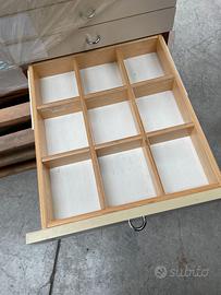 Vendo preferibilmente in blocco, 4 cassettiere con divisori quadrati di circa 12x 12 cm., come da foto. L'ultimo cassetto è di grandi dimensioni e non ha divisorio.