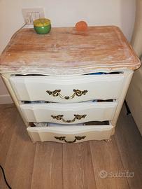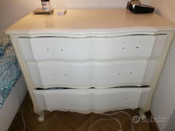 Vendesi due cassettiere vintage stile provenzale in legno massello risalente a metà del '900. Le maniglie elaborate sono originali in ottone abbinate allo stile shabby-chic. La cassettiera grande possiede due maniglie per cassetto, uguali a quelle del mobile piccolo, non presenti in foto (ovviamente incluse e presenti all'interno del primo cassetto). La cassettiera grande presenta alcune imperfezioni minori sul piano dovute all'età del legno e della laccatura. Il piano della cassettiera piccola invece è stato sverniciato in stile shabby-chic e può essere riverniciato o utilizzato tal quale. Dimensioni (profondità*larghezza*altezza): Cassettiera grande: 51cm*93cm*80cm - 150€ Cassettiera piccola: 44cm*60cm*65cm - € 80