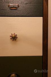 In foto una cassettiera dal disegno regolare e dallo stile vintage. La struttura esterna è realizzata in rovere massello, i cassetti sono in abete colorati a mano con tinte personalizzabili.
