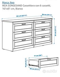 Cassettiera IKEA SONGESAND con 6 cassetti, 161xh81x50 cm colore bianco.