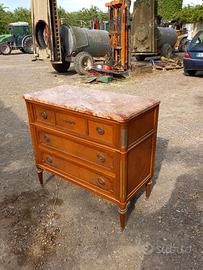 È un cassettone in stile Impero caratterizzato da linee sobrie ed eleganti, tipiche dell’inizio XIX secolo. La struttura è in legno, con una finitura calda e uniforme. La facciata presenta tre cassetti grandi e un cassetto superiore suddiviso in tre sezioni, decorati con maniglie rotonde in metallo dorato e una presa centrale lavorata nel cassetto superiore. Gli angoli sono arricchiti da lesene verticali, con piccoli inserti metallici dorati. Il top in marmo rosa/rosso variegato è un elemento distintivo: massiccio, elegante e perfettamente in linea con la tradizione dell’arredo Impero. L’interno rivela una ribalta a scomparsa rivestita in pelle con filettatura dorata decorativa lungo il perimetro. La parte interna del ribaltabile è organizzata con piccoli cassetti in legno con pomelli ,scomparti aperti ad arco e laterali stondati che donano armonia alla struttura.