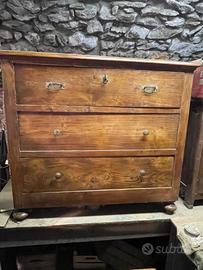 Vendesi cassettone restaurato in ottime condizioni a tre cassetti in abete, il piano è in noce. Dimensioni: larghezza 105 cm, altezza 96 cm, profondità 47 cm.