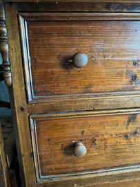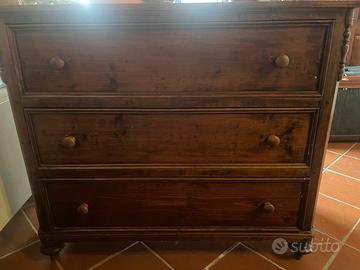 Cassettone antico in legno massello, 3 grandi cassetti, maniglie originali e piedi torniti.