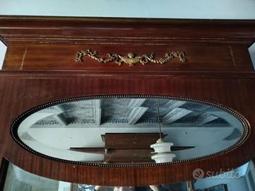 Grande cassettone con specchiera, impiallacciato in legno con colonne laterali, piano in marmo e numerosi cassetti. Specchio centrale ovale con specchi laterali.