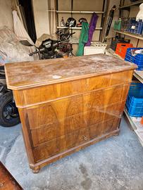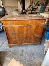 Vendo cassettone antico in legno di noce, risalente ai primi del 1900, con 4 ampi cassetti funzionanti. Mobile solido con belle venature del legno a vista. Mobile ideale per chi desidera effettuare un leggero restauro o valorizzarlo in stile rustico. Domensioni circa: 140×60×95