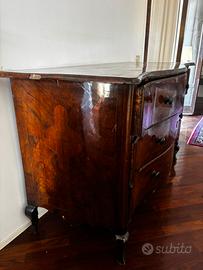 Vendo raffinato cassettone antico fine ’700 / inizi ’800, in radica di noce, con caratteristico fronte mosso e bombato, tipico della produzione lombardo-veneta dell’epoca Luigi XV–XVI.