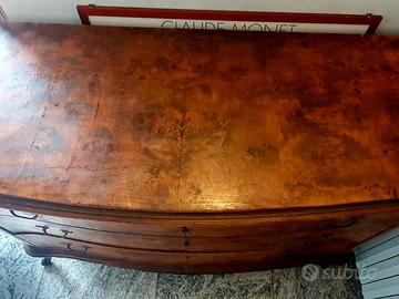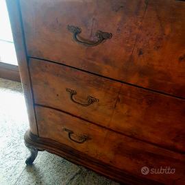 Materiali e Struttura: Il mobile è realizzato in radica di noce e presenta una struttura mossa sia sul fronte che sui fianchi. Dispone di tre ampi cassetti dotati di maniglie in ottone lavorato, gambe ricurve (en cabriole)