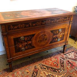 Vendo elegante cassettone antico finemente intarsiato, realizzato con tecnica a marqueterie su legni pregiato. Piano superiore intarsiato con motivi floreali e scena centrale a tema classico/mitologico