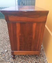 Mobile di sostanza, perfettamente integro e sapientemente ripristinato in patina originale, pronto da collocare. Mobile particolarmente curato, con cassetti che nascondono la catena, completo di fodere e tramezze, arricchito da un motivo in piuma di noce che imbursta il piano.