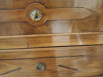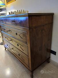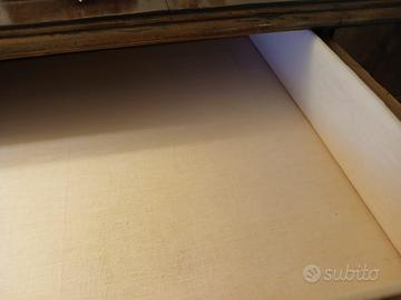Cassettone antico riverniciato e foderato all'interno in stoffa di lino rosa. Lunghezza mt 1.34 Altezza mt 1,02 Profondità cm 56