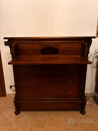 cassettone/secrétaire in legno massello, stile classico , riproduzione di qualità con: •ribalta con vano scrittoio •cassetti superiori piccoli + 3 cassetti grandi •piedi scolpiti •buono stato generale Misura 122x47x110 cm Ottime condizioni .