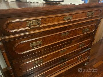 Elegante cassettone d’epoca in legno di noce e radica, con bellissime venature naturali e maniglie in ottone. Dotato di cinque ampi cassetti, è ideale sia come mobile contenitore che come pezzo d’arredo di classe.