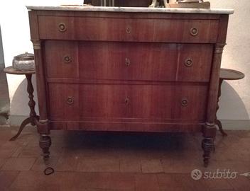 Cassettone Impero, impiallacciato in piuma di noce, con piano di marmo bianco di Carrara e specchiera impiallacciata in noce in legno ebanizzato e bronzo dorato