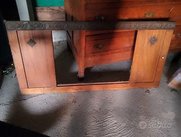 Cassettone in legno di castagno (anni 1920 circa) con applique e maniglie in bronzo, Piano superiore in legno da restaurare o applicare il marmo mancante. Lo stato del legno è in buone condizioni nello stato d’uso in cui si trova. Cassetti misure lunghezza cm112 altezza cm110 profondità cm56. Specchio solo telaio con applique (manca il vetro specchio), ritiro in zona a vostro carico.