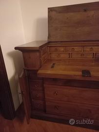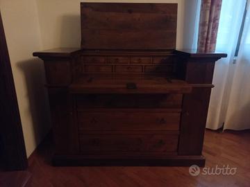 cassettone in noce nazionale, interamente in legno, finitura a cera, con piano a ribalta e cassetti laterali. dimensioni cm 140x100x53