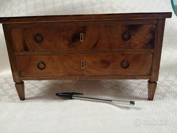 Cassettone in miniatura con legno di noce e radica, fatto interamente a mano in tempi recenti. Pezzo unico