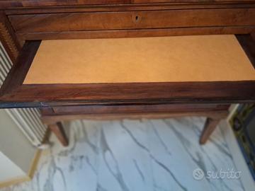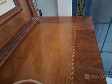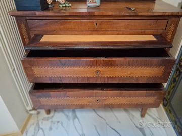 CASSETTONE IN NOCE con intarsi sul davanti sul piano e anche lateralmente.La particolarita' di questo cassettone a tre cassetti e un piano scrittoio a scomparsa sono le dimensioni .