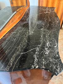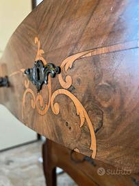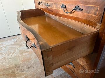 Splendido Cassettone Liberty in Piuma di Noce - Marmo e Specchiera Elegante Cassettone Liberty Primo '900 in Piuma di Noce con Specchiera e Marmo Nero. Vendesi splendido cassettone originale in pieno stile Liberty (Art Nouveau), risalente ai primi del '900. Il mobile rappresenta un eccellente esempio di ebanisteria italiana dell'epoca, caratterizzato da una raffinata linea "a mossa" (sagomata) sia sul fronte che sui fianchi. Dettagli Tecnici e Materiali: - Legno: Lastronatura in pregiata piuma di noce, selezionata per creare giochi di venature speculari di grande impatto visivo. - Intarsi: Splendido medaglione centrale intarsiato a motivi floreali/organici in essenze chiare, tipici del gusto Liberty. - Piano: Lastra originale in marmo nero venato (integro, senza crepe o restauri evidenti), sagomata per seguire il profilo del mobile. - Specchiera: Importante cimasa con cornice in noce coordinata e specchio originale dell'epoca. Dimensioni: - Larghezza: 140 cm - Profondità: 54,5 cm - Altezza senza specchio: 103 cm - Altezza con specchio: 195 cm Ferramenta: Maniglie e bocchette in bronzo brunito lavorato originali. Costruzione: Cassetti realizzati con incastri a coda di rondine fatti a mano, sinonimo di alta qualità costruttiva e robustezza. Stato di Conservazione: Il mobile si presenta in ottime condizioni generali. La struttura è solida, il legno ha una bellissima patina naturale e non presenta segni di tarlo attivo. Pronto per essere inserito in un salone, una camera da letto o un ingresso di rappresentanza senza necessità di restauro. Note per la vendita: Ritiro: A carico dell'acquirente (consigliati almeno due operatori dato il peso del marmo e del mobile).
