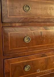 Cassettone Luigi XVI con intarsi del ‘700. Completamente restaurato e sottoposto a trattamento antitarlo. Misure: Lunghezza cm. 124 Alt. cm 95 Prof. cm.53