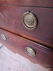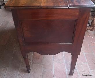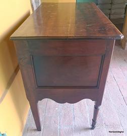 Mobile corposo e perfettamente in patina, fulgido esempio della rigorosità stilistica del periodo. Presenta due cassetti in battuta sgorbiati, fianchi pannellati, piano a becco di civetta e grembiuli sagomati, con schiena applicata a chiodo su piantoni di gusto neoclassico.
