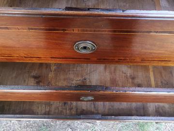 Mobile proporzionato e scenografico, sostenuto da quattro piedi a tronco di piramide con gola rimarcata. Ferramenta coeva presente e funzionante, interni e fodere in pioppo. Conservato in splendida patina originale.