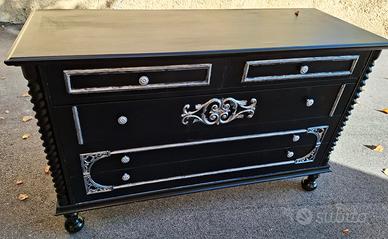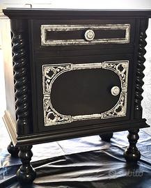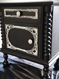 Questo set, composto da comodino e comò o cassettone, è stato completamente rinnovato per esaltarne la struttura classica con un’estetica elegante e moderna. I dettagli intagliati e le colonne tornite sono stati valorizzati con una finitura argentata in stile matt- che crea contrasto e profondità. Ideali per ambienti sofisticati, camere da letto o spazi dal gusto vintage contemporaneo. per la vendita e spedizione contattatemi grazie.