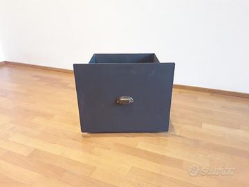 Il cassettone può essere inserito sotto un caminetto oppure indipendente, è di colore grigio antracite e le misure sono: larghezza cm.38/43 - profondità cm.44 - altezza cm.30/36.
