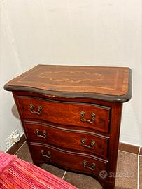 elegante cassettone antico e comó in noce, caratterizzato da intarsi dettagliati sui frontali dei cassetti e maniglie in ottone.